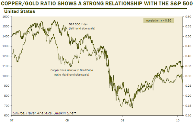 Cuando el precio del cobre baja suele ser señal de que se avecina una recesión. De hecho, en Wall Street, al cobre le llaman Dr. Copper a modo de un «adivino» que predice la evolución de la economía. El oro por otro lado, es un activo refugio por excelencia. Así pues, cuando sube el cobre significa optimismo en una expansión económica basada en un incremento de la demanda en sectores como la construcción, el transporte y la industria. cuando el oro sube es lo contrario, miedo, temores, incertidumbre, el dinero sale de la Bolsa y busca cobijo en el oro. Si dividimos el precio del cobre por el del oro tendremos una visión de las expectativas económicas del mercado.