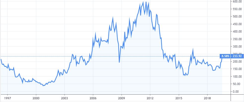 En momentos de incertidumbre los inversores optan por comprar oro, por lo que el ratio sube (es lo que pasa hoy en día y lo que sucedió con la crisis de 2008). Marcó un máximo de 100 en en año 1991 con la Guerra del Golfo. La media de los últimos 20 años es de 60.