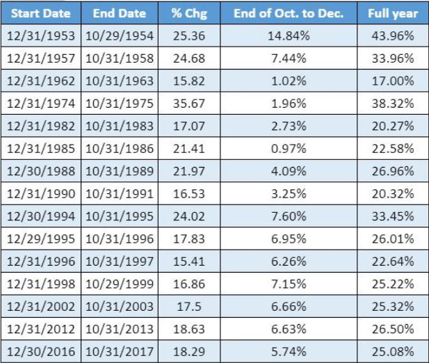 – Los datos de Dow Jones Data Group que se remontan a 1950 indican que cuando el Dow Jones Jones Industrial y el índice S&P 500 cierran octubre con una ganancia considerable, las subidas para el resto del año está casi asegurado y además esas ganancias, históricamente, son notablemente elevadas. Concretamente, cuando el Dow Jones ha subido al menos un 15% de enero a final de octubre, el índice cuenta con un rendimiento medio del 5,55% durante el próximo período de dos meses, con un rendimiento medio anual de 27,17 %. Del mismo modo, cuando el S&P 500 ha ganado al menos un 20% hasta el 31 de octubre, el rendimiento del índice es del 6,21% de media para lo que resta de año, con una ganancia media anual del 33,8%. El Nasdaq ha ganado el 90% de las veces cuando sube al menos un 20% en el año a cierre de octubre, con un rendimiento medio de 7,48% para el resto del año y una ganancia al final del ejercicio de 42,81%.