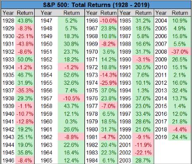 – Evolución del S&P500 total returns desde el año 1928 a 2019.