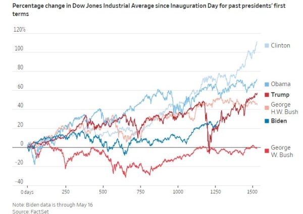 Y en este otro gráfico podemos ver la evolución del Dow Jones con los últimos presidentes del país (Bush padre, Bush hijo, Clinton, Obama, Trump y Biden). Está claro con quién salió más victorioso y con quien menos.
