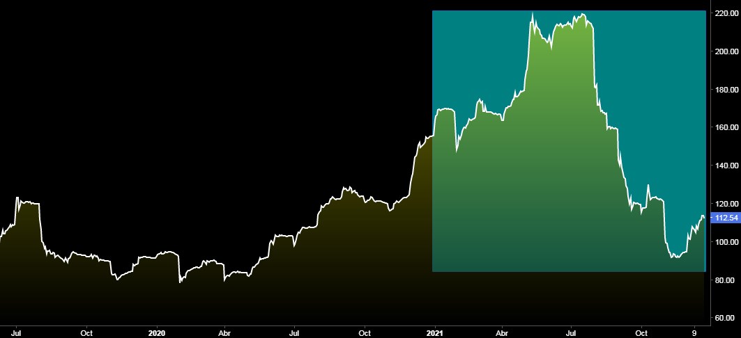 Comenzó el ejercicio subiendo de 164 a 218 dólares en los primeros siete meses del año para justo desde el mes de julio caer con fuerza de 218 a 92 dólares el pasado mes de noviembre y desde ahí ha subido de momento a 113 dólares.