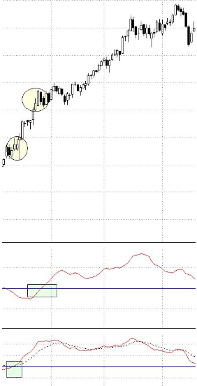 En el siguiente gráfico le pongo un ejemplo práctico realmente muy bueno y verá qué sencillo todo y sobre todo efectivo. En primer lugar el MACD (es el indicador que está abajo del todo) acaba de dar una señal de compra (indicador con un cuadrado) y el precio del mercado empieza a tirar al alza y a subir. Justo después, el ADX cruza por encima de la zona de 20 (indicado por un cuadrado) con lo que indica que la fortaleza de esa tendencia alcista que nos avisó el MACD es interesante.