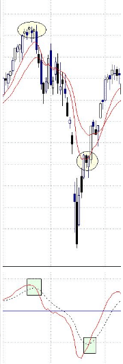 Un ejemplo más. Se han cruzado a la baja la línea continua y la línea discontinua (recuadro) y coincide con el inicio de las caídas en el precio del mercado (círculo). Luego se han cruzado al alza la línea continua y la línea discontinua (recuadro) y coincide también con el inicio de las subidas en el precio del mercado (círculo).