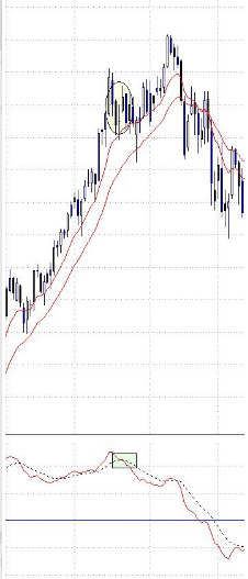 Veamos un ejemplo. La tendencia del mercado es alcista y de repente el MACD se gira a la baja, como se ve en el recuadro (se cruzan hacia abajo la línea continua y la línea discontinua, de manera que tendríamos una señal de ventas según la modalidad rápida). En cambio, justo cuando el MACD ha generado una señal de venta el precio del mercado sigue subiendo (círculo). Este hecho implica que el mercado podría girarse a la baja, cosa que efectivamente hizo después.