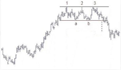 Este patrón se caracteriza por estar formado por tres (o incluso más) techos o máximos, intercalados entre ellos con suelos o mínimos. Pero hay que añadirle una particularidad, que a medida que se van creando y formando nuevos máximos o techos el volumen tiende a ir disminuyendo.