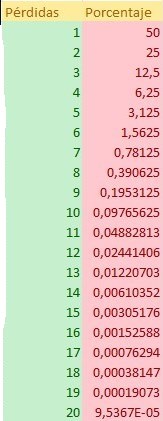 Por tanto, si fallamos 4 tiradas y acertamos a la quinta, el resultado será el siguiente: -1-2-4-8+16 = 1 euro.