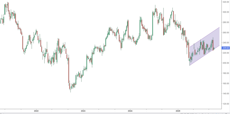 Idea operativa: recientemente recortó sus previsiones de ingresos y beneficios tras debilidad en la demanda de la industria, de manera que aun no compraría como inversión, pero para una operación de corto plazo se podría esperar a ver si bajase a 216,34 para buscar un rebote al alza en busca de un primer objetivo de 3-4%.