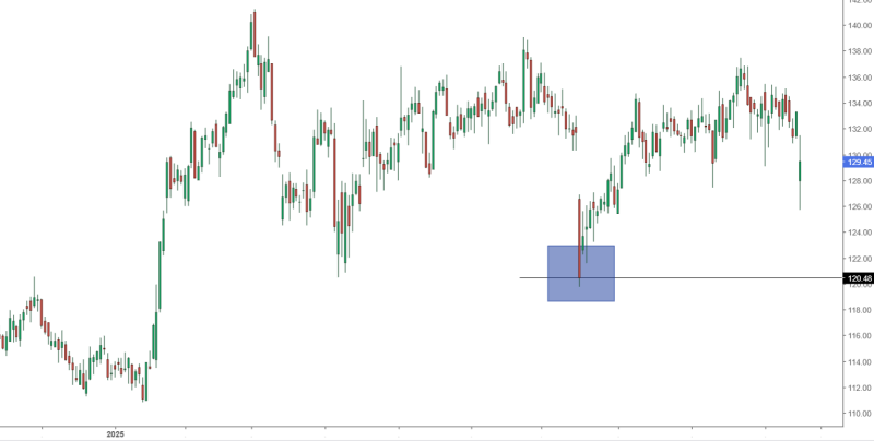 Idea operativa: solo operaría en esta acción si bajase a su soporte interesante de 120,51 dólares para buscar un rebote al alza con un primer objetivo del 3-4%.