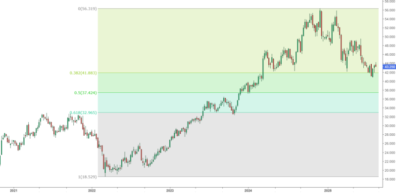 Precio por fundamentales: 42,82 euros, de manera que sus acciones cotizan prácticamente a la par que su valor atendiendo a sus fundamentales.