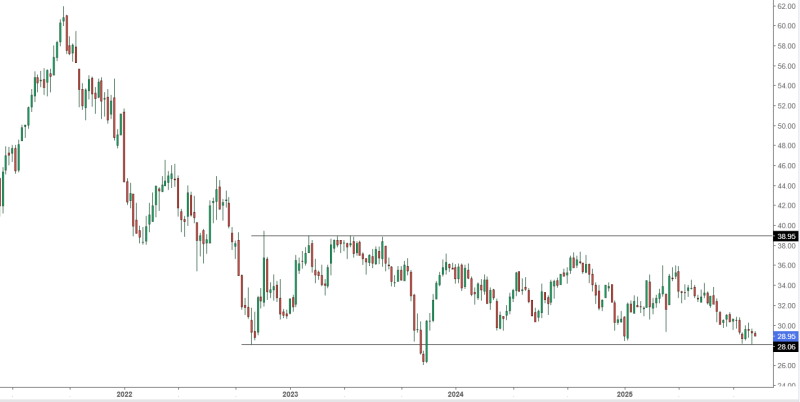Idea operativa: está débil pero barata. Una opción de cara a inversores de medio-largo plazo sería dividir el capital en dos partes iguales y meter una de ellas en 28,27 y la otra si baja a 26,26.