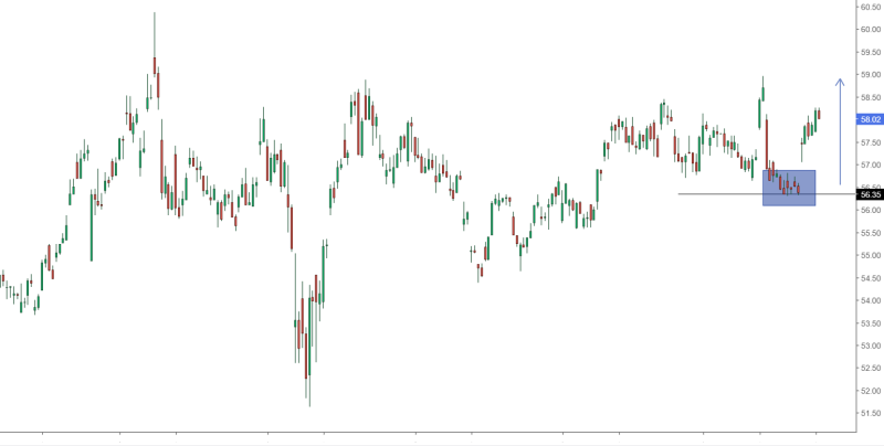 Idea operativa: optaría en este caso no por inversión, sino por una operación de corto plazo en busca de un rebote si baja a 56,31 dólares de al menos un 2-4%.