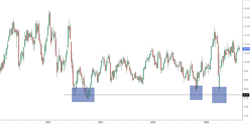 Si lo que busca es una operación de corto plazo, la zona de 9,94 euros podría ser válida para buscar rebote al alza, ya que se trata de un soporte que aparece prácticamente en todos los gráficos al margen de su temporalidad.