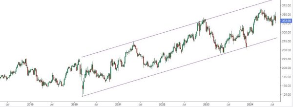 El mercado le da un precio objetivo en torno a los 394,73 dólares, incluso algunos, como JP Morgan lo eleva a los 430 dólares.