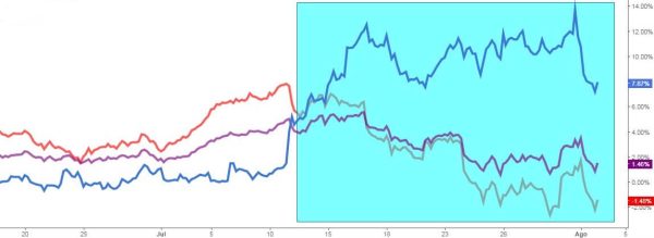 En el gráfico puedes ver cómo desde mediados de julio el Russell 2000 supera al S&P 500 y al Nasdaq.