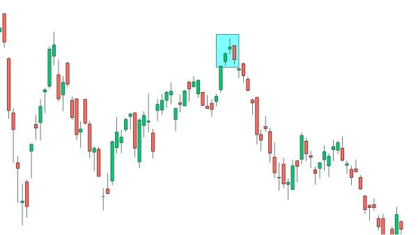 1º El mercado se encuentra en tendencia alcista, de manera que está subiendo. De pronto, en la recta final de la tendencia alcista, aparecen 3 velas consecutivas.