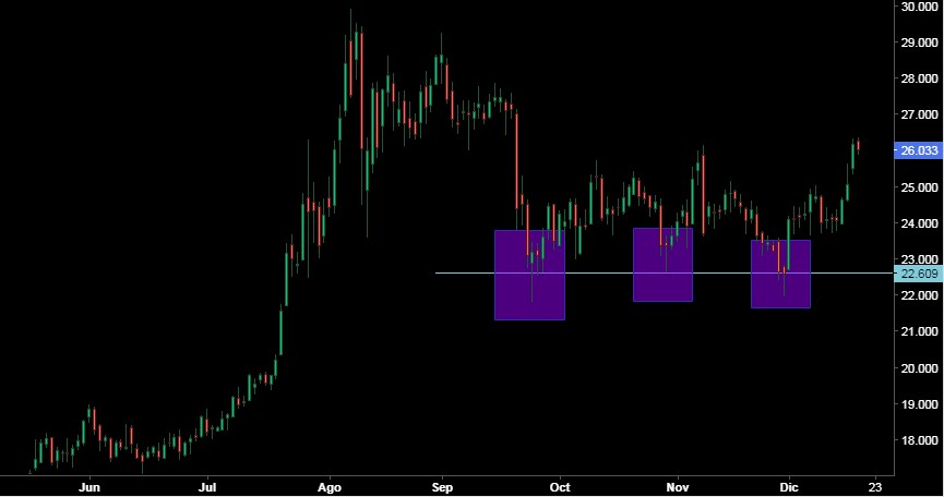 Destacar también que el jueves ha intentado por primera vez salir del rango lateral hacia arriba, intentando romper la zona de los 25,86 dólares que es la clave para ello, De momento, el mismo jueves lo logró cerrando la sesión por encima de dicha zona y el viernes abriendo también por encima. Ahora hay que estar atentos para comprobar que no se trate de un falso movimiento de ruptura y para eso veremos si se produce un throwback.