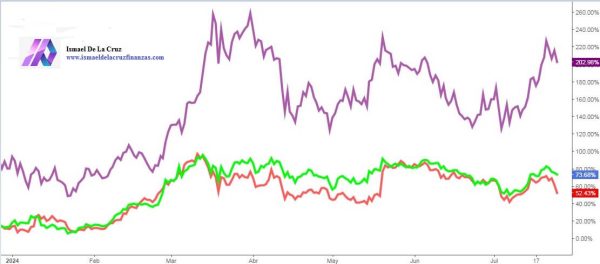 En el gráfico podemos ver la evolución este año 2024 de las tres criptomonedas: Bitcoin en verde, Ethereum en rojo y Solana en malva.