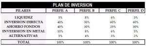 Es interesante introducir en cartera un porcentaje del patrimonio en Oro principalmente y algún otro metal precioso (plata, paladio y platino) como cobertura. La inversión ha de realizarse en metal físico y mediante planes de compra periódica. La combinación entre los diferentes metales dependerá de la situación del mercado y se podrán realizar los ajustes que se crean conveniente para aprovechar la debilidad y fortaleza de cada metal en cada entorno de mercado.