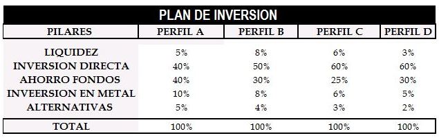 Es interesante introducir en cartera un porcentaje del patrimonio en Oro principalmente y algún otro metal precioso (plata, paladio y platino) como cobertura. La inversión ha de realizarse en metal físico y mediante planes de compra periódica. La combinación entre los diferentes metales dependerá de la situación del mercado y se podrán realizar los ajustes que se crean conveniente para aprovechar la debilidad y fortaleza de cada metal en cada entorno de mercado.