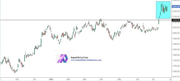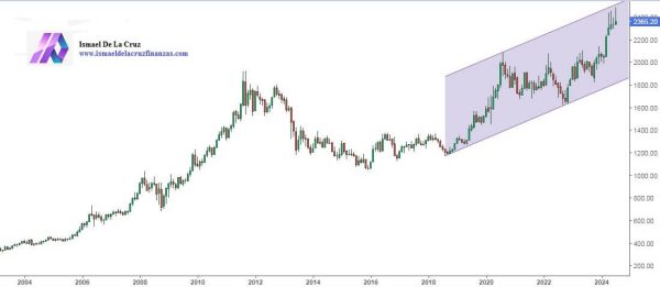 El 19 de diciembre comenté que el oro podría subir a medio plazo a los 2300-2400 dólares. Ese día abrió en 2041 dólares. El 12 de abril (casi 4 meses después) alcanzó los 2400 dólares.