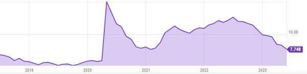 Si nos vamos a lo más reciente, que es cuando he escrito este post, tenemos que a finales de junio del 2023 lleva bajando 11 meses consecutivos, de momento hoy, 26 de junio, a niveles no vistos desde el inicio del año 2021 que fue 7,74 (justo hace un año, a finales de junio de 2022 estaba en 12,18).