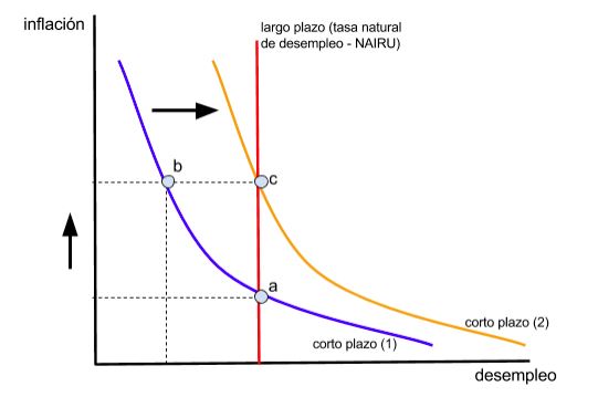 ¿Y por qué a largo plazo hay problemas? Por largo plazo hay que entender más de 1 año. Pues porque la oferta y demanda tienden a ajustarse, lo que se refleja en sucesivos desplazamientos de la curva hacia la derecha hasta que el desempleo alcanza la tasa natural de desempleo (NAIRU). Por tanto, a largo plazo, la tasa de desempleo no se ve afectada por la tasa de inflación (subirán y bajarán los precios, sin que por ello aumente o disminuya el paro).