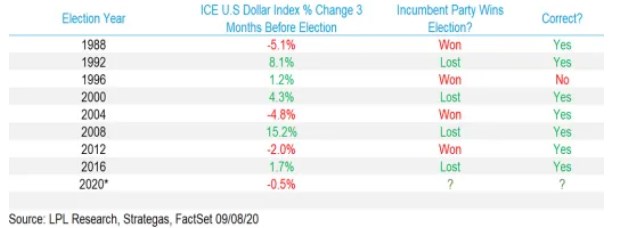 2) El dólar también suele dar pistas acerca de quién ganará las elecciones. Si el billete verde está débil tres meses antes de las elecciones favorece al partido que está en el poder, en cambio si está débil favorece a la oposición. Ésto ha sucedido casi siempre.