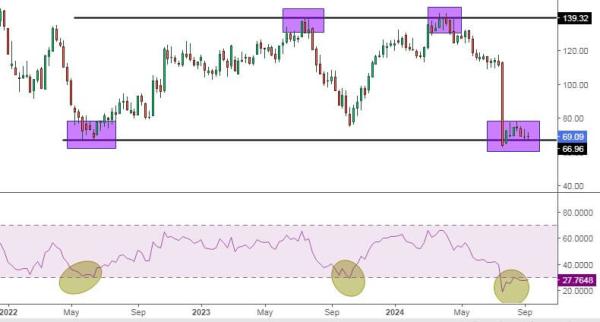 Como se puede ver en el gráfico, llegó a su fuerte soporte y de momento, aunque lo respeta y no lo pierde, el rebote al alza no está siendo importante. Lo que sí que está actuando muy bien es la sobreventa, ya que cada vez que aparece, el precio de la acción sube con fuerza. Sucedió las dos veces anteriores (junio de 2022 y octubre de 2023). Ahora ha vuelto a suceder, y además con mayor claridad.
