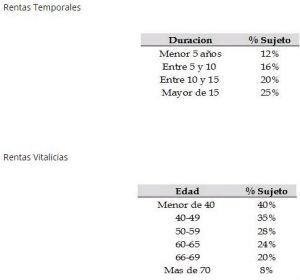 En el caso de rentas vitalicias o temporales, el rendimiento a integrar en la base imponible del ahorro se multiplicará por un determinado porcentaje en función de la edad del rentista en el momento de constitución de la renta, en el caso de las rentas vitalicias, o en función de la duración de la renta, en el caso de rentas temporales