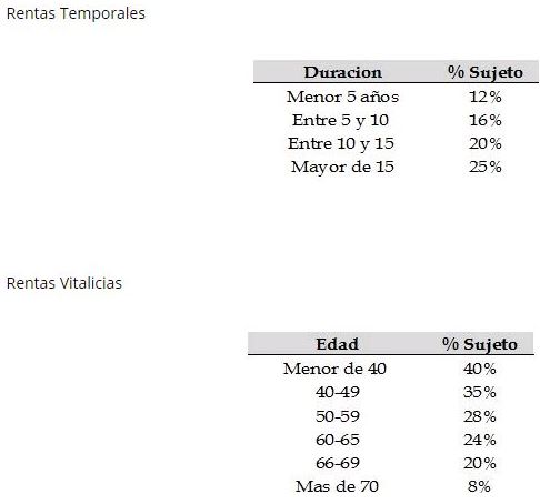 En el caso de rentas vitalicias o temporales, el rendimiento a integrar en la base imponible del ahorro se multiplicará por un determinado porcentaje en función de la edad del rentista en el momento de constitución de la renta, en el caso de las rentas vitalicias, o en función de la duración de la renta, en el caso de rentas temporales